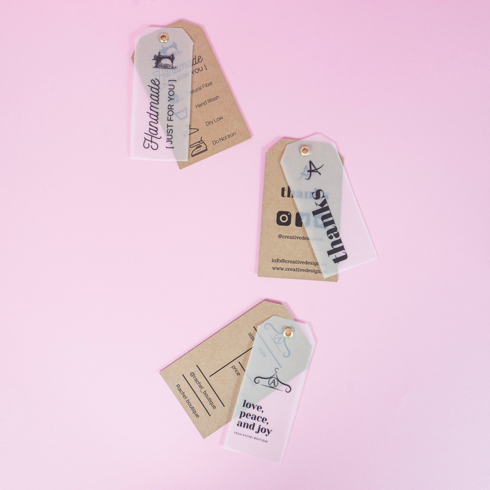 يمكنك أن تضع شعار علامتك التجارية على التاق مع عبارة لطيفة تعلق في الذاكرة وتدفع العميل للاحتفاظ بها.